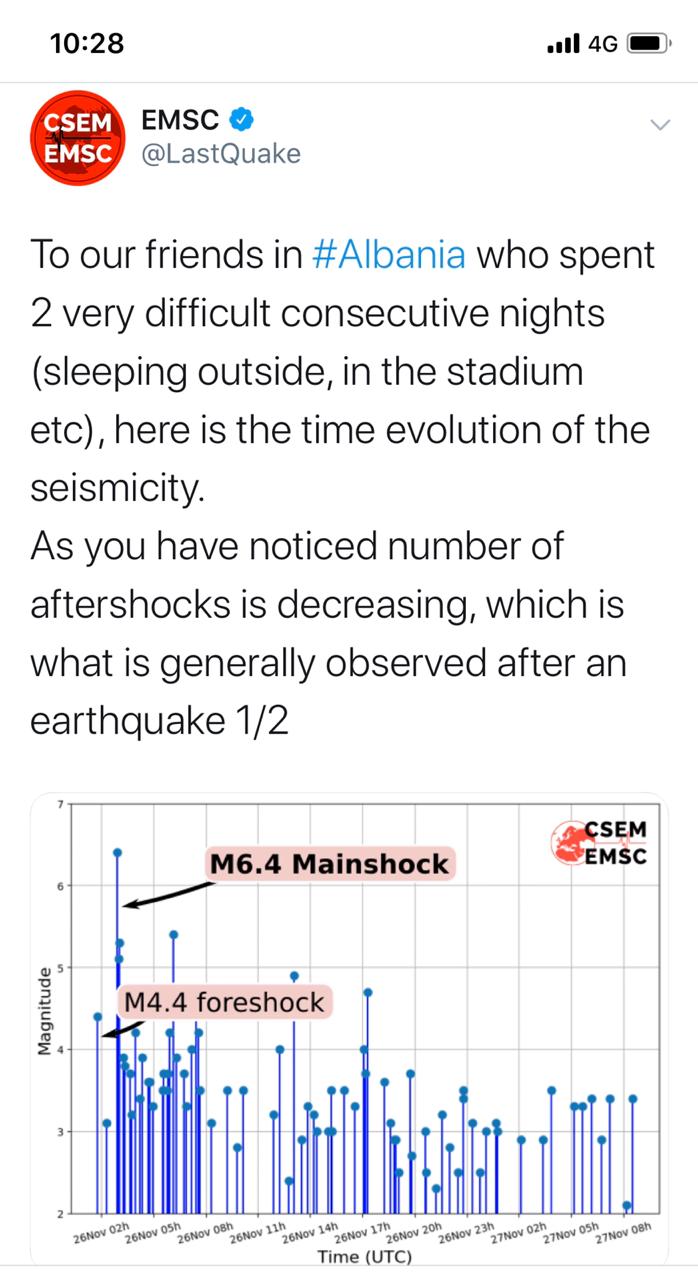 “Për miqtë tanë në Shqipëri që kaluan 2 netë shumë të vështira, këtu është evolucioni në kohë i sizmicitetit.