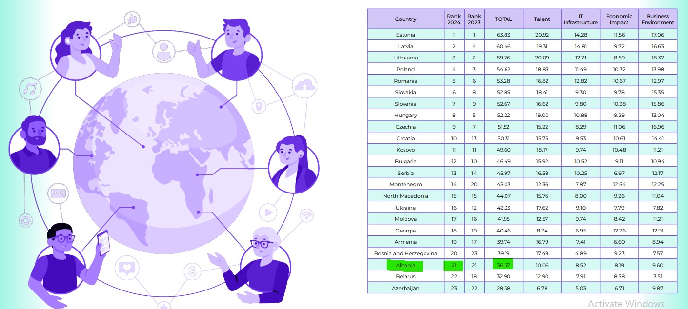 Shqipëria renditet në vendin e 21, mes 23 vendeve, duke marrë një vlerësim total 36.37 pikë në 4 seksione (Talenti, Infrastruktura e IT-së, Ndikimi ekonomik dhe Mjedisi i Biznesit), shumë më poshtë Kosovës dhe vendeve të tjera të Ballkanit.