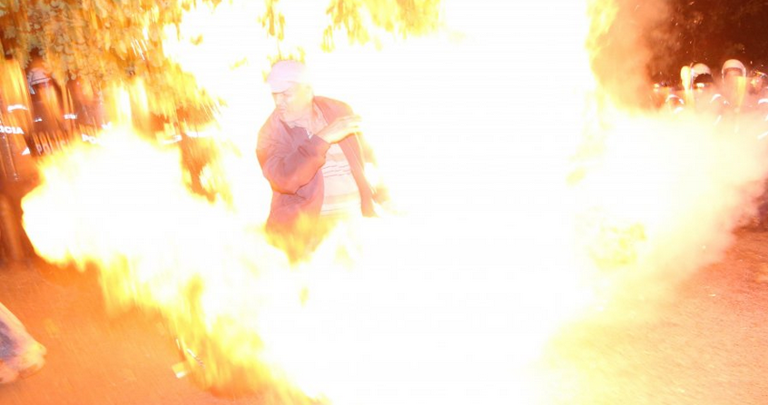 Ky është babi im. Një nga flakëhedhëset që një protestues e hodhi në drejtim të bashkisë, një nga policët ia hodhi babit te këmbët. Babi mori flakë. Unë u sula t’ia shuaj,  bashkë me protestues të tjerë. U dogja dhe unë. Pas disa minutash, ku godisnim me ç’të mundnim, flaka u shua. Gjatë gjithë kësaj kohe, policët për asnjë çast nuk na hodhën ujin me të cilin shpërndanin protestuesit.