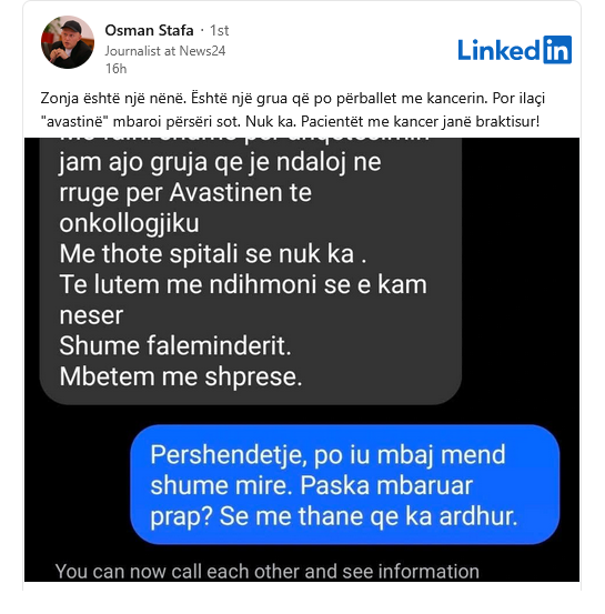 Gazetari Osman Stafa që ndjek me shumë përkushtim problemet e Onkologjikut me pasojë jetën e pacientëve, boton në rrjetin social komunikimet që ka pasur me një paciente të onkologjikut, e cila e njofton Osman Stafën se nuk ka medikamente për vazhdimin e kurës. Ja si shkruan Osman Stafa: