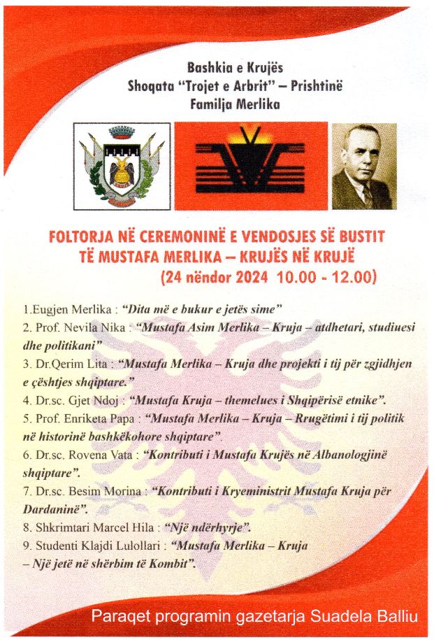 Ftoheni të merrni pjesë në ceremoninë e vendosjës së bustit në sheshin e qytetit të Krujës të atdhetarit Mustafa Merlika – Kruja, nënshkrues për Krujën i Dokumentit të Shpalljes së Pavarësisë në Vlorë më, 28 nëndor 1912, shtetar, historian, gjuhëtar dhe publicist.