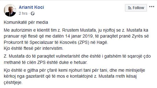 Lajmi u bë i ditur nga avokati i tij, Arianit Koci, i cili në një postim në rrjetin social Facebook, tha se ftesa është datën 14 janar të vitit 2019 dhe zoti Mustafa “do të paraqitet vullnetarisht dhe është i gatshëm të sqarojë çdo rrethanë të cilën Zyra e Prokurorit është duke e hetuar”.