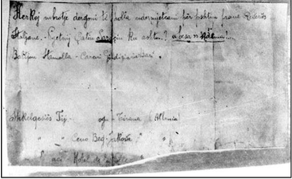 Fotokopje e origjinalit të letres së Baltion Stamollës, e ruejtun nga Atdhetari Gjon Kamsi, sot në Muzeun e Shtetit në Shkoder. (Foto 2009):