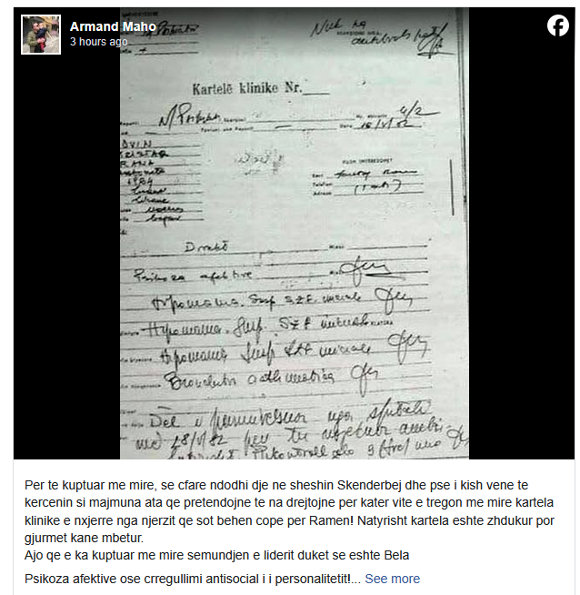 Për të kuptuar me mirë, se çfarë ndodhi dje ne sheshin Skenderbej dhe pse i kish vene të kercenin si majmuna ata qe pretendojne te na drejtojne per kater vite e tregon me mire kartela klinike e nxjerre nga njerzit qe sot behen cope per Ramen!” shkruan Maho.