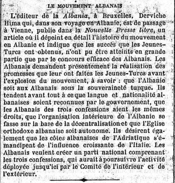 Publicisti Dervish Hima për Neue Freie Presse (1908): “Shqiptarët kërkojnë përmbushjen e premtimeve që u janë bërë nga xhonturqit.”