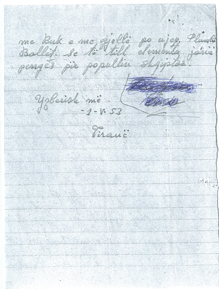 Për periudhën 1 janar 1955, 30 mars 1957, t’i thuhet se shpërblimi i caktuar nuk i jepet, për arsye se nuk ka vepruar sipas udhëzimeve tona, dhe si konsekuencë ka shkëputur lidhjet me zbulimet e huaja dhe nuk ka treguar interesim për zbatimin e detyrave të ngarkuara.