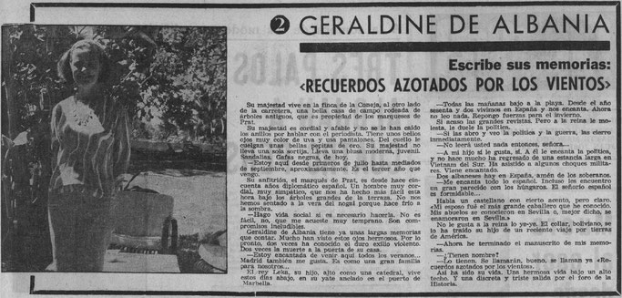 “Pueblo” ka botuar, të martën e 29 gushtit 1967, në faqen n°15, intervistën ekskluzive me Mbretëreshën Geraldinë në Spanjë, në lidhje me dorëshkrimin e përfunduar të saj “Kujtime të fshikulluara nga erërat”, të cilën, Aurenc Bebja, nëpërmjet Blogut “Dars (Klos), Mat – Albania”, e ka sjellë për publikun shqiptar :