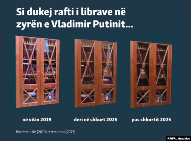 Rafti i librave mund të tregojë shumë për pronarin. Në rastin e presidentit të Rusisë, Vladimir Putin, rregullimi më i fundit i librave në një dollap pas tavolinës së tij tregon se Kremlini i ka paraqitur pamjet e vjetra të takimeve në zyrën e tij si video të reja të paktën pesë herë këtë vit, ka zbuluar njësia hulumtuese ruse e Radios Evropa e Lirë, Systema.