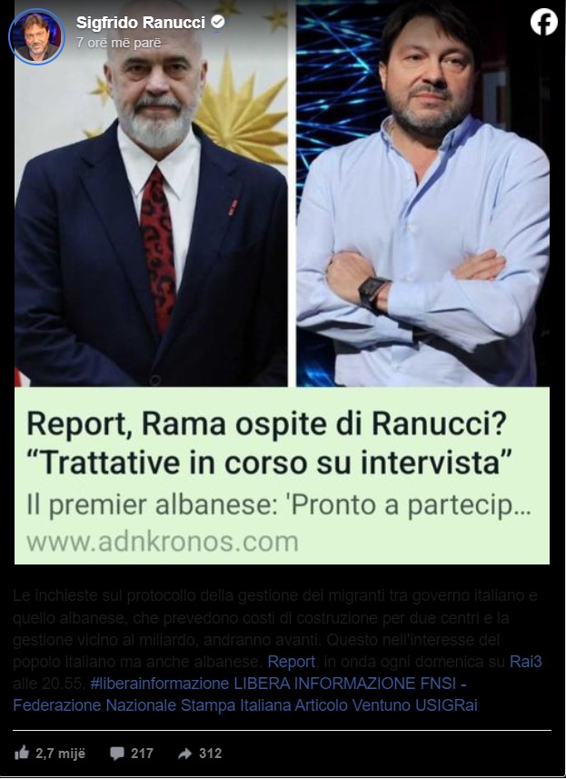 Ndryshe nga raportimet gjatë ditës të autorit të emisionit “Report”, Sigfrido Ranucci, televizioni shtetëror italian RAI 3 nuk e ka transmetuar mbrëmjen e kësaj të diele pjesën e dytë të investigimit për marrëveshjen e refugjatëve mes Italisë dhe Shqipërisë.