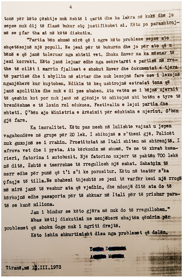 Për periudhën 1 janar 1955, 30 mars 1957, t’i thuhet se shpërblimi i caktuar nuk i jepet, për arsye se nuk ka vepruar sipas udhëzimeve tona, dhe si konsekuencë ka shkëputur lidhjet me zbulimet e huaja dhe nuk ka treguar interesim për zbatimin e detyrave të ngarkuara.