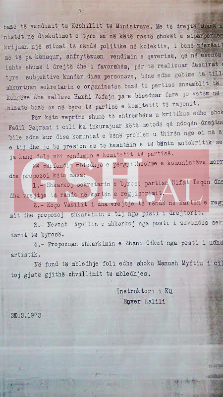 Për periudhën 1 janar 1955, 30 mars 1957, t’i thuhet se shpërblimi i caktuar nuk i jepet, për arsye se nuk ka vepruar sipas udhëzimeve tona, dhe si konsekuencë ka shkëputur lidhjet me zbulimet e huaja dhe nuk ka treguar interesim për zbatimin e detyrave të ngarkuara.