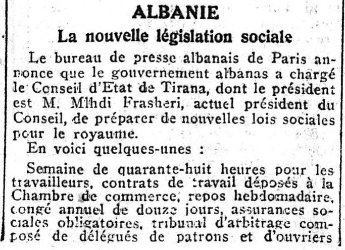 Reformat sociale në kohën e Mbretit Zog (1936): javë pune 48 orëshe, 12 ditë pushim vjetor, sigurime shoqërore të detyrueshme, gjykatë arbitrazhi…