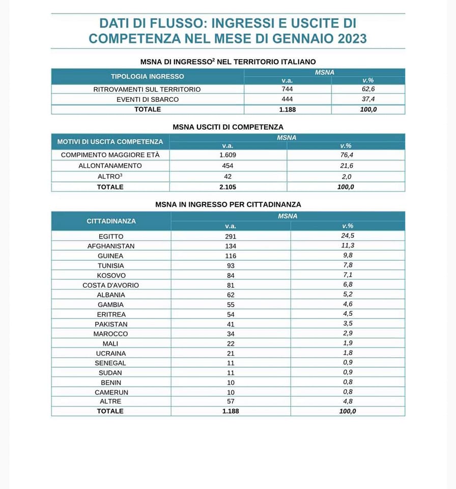 Brenda një muaji nga 1 janari në 31 janar 2023 në Itali kanë kërkuar strehim 62 minorë shqiptarë pa prindër e 84 minorenë nga Kosova duke lënë pas emigrantët minorenë që mbërrijnë nga Ukraina, Sudan, Mali, Pakistan, Marok etj.