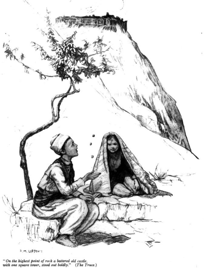 Kështu që nën pemën e ullirit, dy djemtë shtrënguan duart dhe u betuan për miqësi të përjetshme, ndërsa shumë lart sipër tyre dy shqiponja mali fluturonin ngadalë me krahë të sheshtë rreth kullës së errët të Skënderbeut, dhe përmes reve që thyheshin, Adriatiku shkëlqente si një vijë argjendi në horizont.
