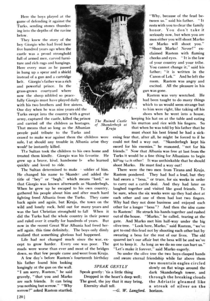 Sulltani vendosi ta bënte ushtar. Ai e ndryshoi emrin e tij në Skënder dhe shtoi titullin “bej” ose “beg”, që do të thotë “zot”, kështu që Gjergji u njoh më vonë si Skënderbeu. Kur u rrit, ai iku në vendin e tij, mblodhi njerëzit e tij rreth vetes dhe pas shumë luftimesh të ashpra çliroi Shqipërinë nga turqit. Ata u kthyen vazhdimisht, por Kruja, qyteti mbi shkëmbin e egër dhe të vetmuar, rezistoi për shumë vite dhe ishte fortesa e fundit e krishterë që ra. Kur ra, turqit kishin të gjithë vendin nën kontrollin e tyre. Por tani në Luftën e Madhe të kohëve të fundit, Shqipëria e kishte çliruar veten përsëri, këtë herë përfundimisht. Djemtë e kuptuan vetëm paksa se diçka e lavdishme kishte ndodhur.