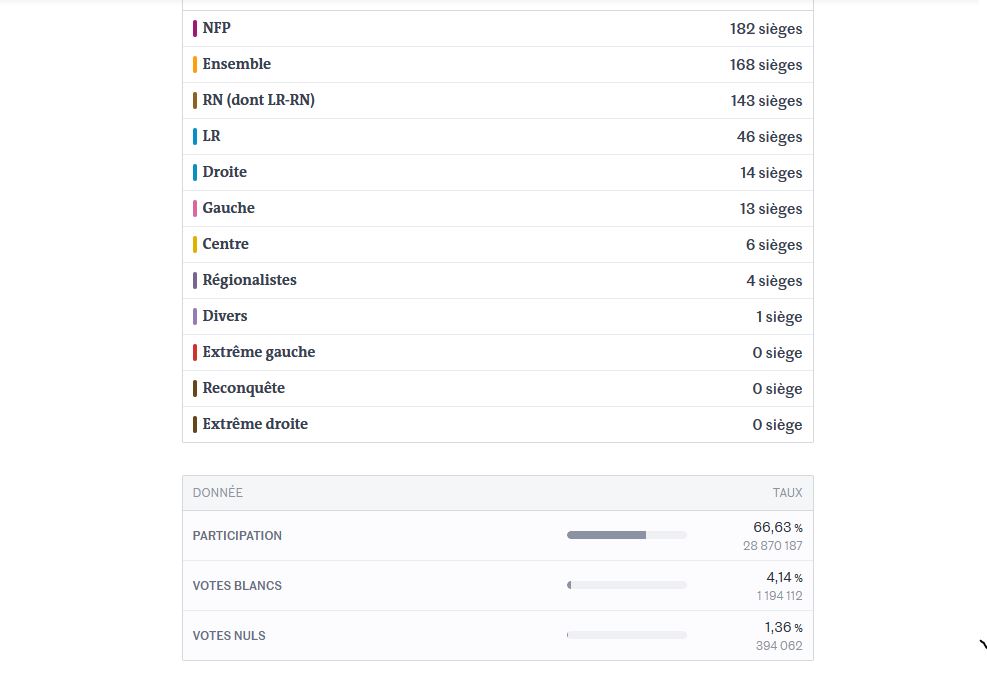Ndërsa sipas të dhënave përfundimtare të shpallura nga Ministria e Brendshme e Francës pas raundit të dytë të zgjedhjeve legjislative këtë të dielë, me pjesëmarrje prej 66,63 për qind dhe numrin e përgjithshëm të mandateve sipas partive.