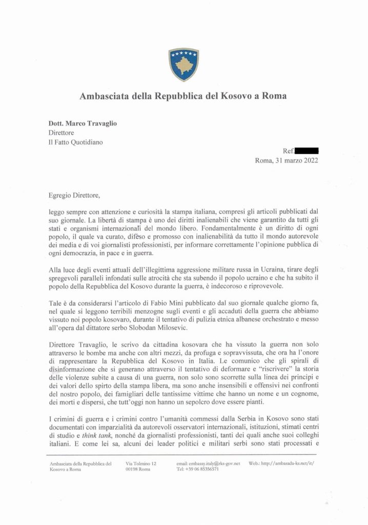Romë Ambasadorja e Kosovës Lendita Haxhitasim letër ankuese ndaj shkrimit të “Il fato Quotidiano” Nga Alba Kepi