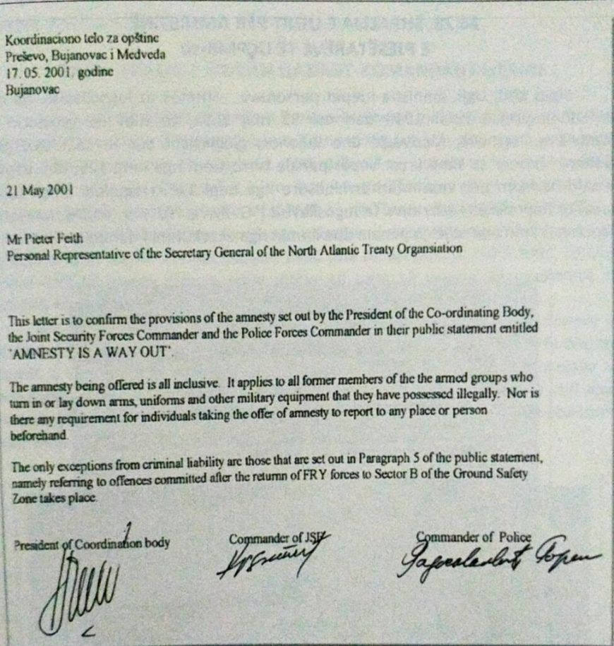 II. Amnistia e ish-ushtarëve të UÇPMB-së nuk është respektuar, sepse pas Marrëveshjes së Konçulit shumë Ushtarë pas dorëzimit të armëve nënë mbykqyreje, monitorimi e garantimin e ndërkombëtarë jan ballafaqur e përballur me ftesa të pranura në biseda të shpeshta informative, jan keqëtrajtuar, maltretuar dhe u jan ngritur e kurdisur skenare për burgojes e arrestime,