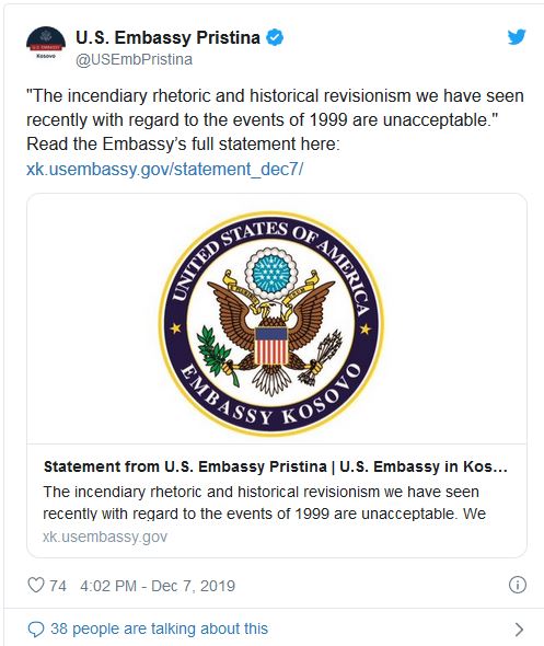 Të shtunën ambasada amerikane tha në një deklaratë se “retorika nxitëse dhe revizionizmi i historisë që kemi parë kohëve të fundit lidhur me ngjarjet e vitit 1999 janë të papranueshme. Gjithashtu, duhet kujdes në përndjekjen penale selektive të fjalës duke u bazuar në orientimin politik apo në komunitet. Liria e shprehjes ka qenë prej kohësh parimi themelor i demokracisë. Ngjarjet e kësaj jave paraqesin edhe një rikujtim se sa i rëndësishëm është kthimi i Kosovës dhe Serbisë në tryezën e bisedimeve dhe ri përqendrimi i energjive të tyre drejt së ardhmes duke normalizuar marrëdhëniet ndërmjet tyre”.