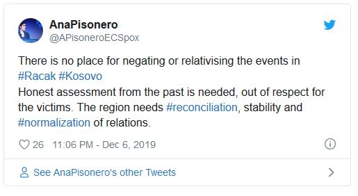 Një zëdhënëse e Bashkimit Evropian tha se “nuk ka vend për të mohuar apo relativizuar ngjarjet në Reçak të Kosovës. Vlerësimi i ndershëm i së kaluarës është i nevojshëm për shkak të respektit ndaj viktimave. Rajoni ka nevojë për pajtim, qëndrueshmëri dhe normalizim të marrëdhënieve”, shkroi ajo.