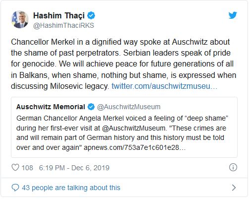 “Kancelarja Merkel në mënyrë dinjitoze foli në Auschwitz për turpin e autorëve të krimit. Udhëheqësit serbë flasin me krenari për gjenocidin. Ne do të arrijmë paqe për brezat e ardhshëm në Ballkan vetëm atëherë kur diskutimet për trashëgiminë e Millosheviçit do të përshkohen nga turpi dhe asgjë tjetër veç turpit”, shkroi presidenti Thaçi.