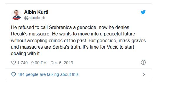 Kryetari i Lëvizjes Vetëvendosje, Albin Kurti, tha se “ai (Vuçiç) refuzon ta quajë atë që ka ndodhur në Srebrenicë – gjenocid. Tani mohon masakrën e Reçakut. Ai dëshiron të ecë drejt së ardhmes paqësore pa i pranuar krimet e së kaluarës. Por, gjenocidi, varrezat masive dhe masakrat janë e vërteta e Serbisë. Është koha që Vuçiçi të përballet me këtë”, shkroi ai.