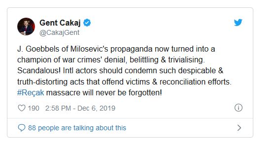 Ushtruesi i detyrës së ministrit të Jashtëm të Shqipërisë, Gent Cakaj, shkroi se “Goebbelsi i propagandës së Millosheviçit tash është shndërruar në kampion të mohimit të krimeve të luftës. Skandaloze. Përfaqësuesit ndërkombëtar do të duhej të dënonin aktet e tilla me të cilat shtrembërohet e vërteta, fyhen viktimat dhe përpjekjet për ripajtim”.