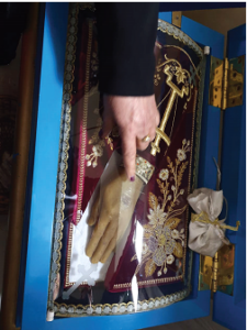 Dora e majtë e Shen Nënë Angjelinës, me stigmën (shenjën) në shpinën e dorës, e ruajtur në kuti xhami.