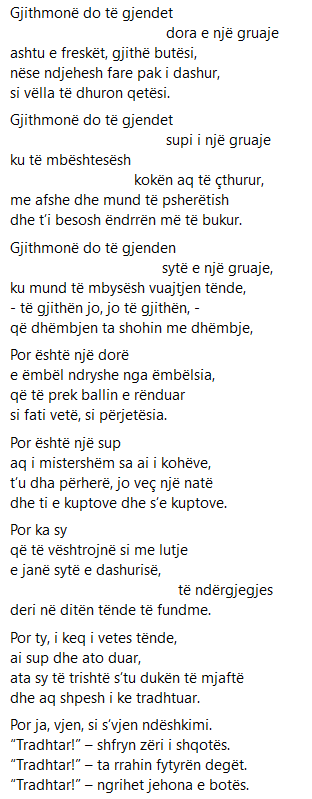 Është një poezi dashurie, që e kam njohur herët, që student, në “moshën e artë”, siç thuhet, e dua shumë dhe tani dhe e kam ndjerë si timen gjithë jetën dhe kam kaluar vështirësi dhe me atë.