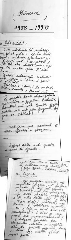 Mendoj se letërsia mëton thelbin e shpirtit njerëzor, atë pikë ku të gjithë njerëzit kanë pak a shumë të njëjtin kuptim të gjërave. Por vetjet në roman ecin, zhvillohen secili sipas natyrës së vet. Kjo e bën ndryshimin. Njeriu ka një tërheqje të fortë ndaj fëmijërisë së vet, ka shumë kujtime që mbesin të gjalla. Ndërkaq nuk ka shumë vepra në të cilat vetja kryesore të jetë vetë autori. Ti rrëfen për veten tënde. Eshtë një fushë letrare e minuar, duhet ecur me shumë kujdes. Ti e ke fillin që të lidh me veten, por ti nuk po thua kujtimet. Ti po end një cohë, në të cilën duhet të dalë koha, njerëzit dhe mes tyre, mbase me më shumë hapësirë apo dritë, shfaqesh edhe ti. Ti duhet të rikrijosh veten ashtu sikurse do të rikrijosh gjithçka, mjediset, kohën, mendësitë, vetjet. Shtysa kryesore është se ti duhet të krijosh një vepër arti, që të le mbresa, të bën të mendosh, që i ve në lëvizje fijet e tua të brendshme. Dhe nëse flasim, siç thamë për letërsi bashkëkohore që aq bukur ti e krahason me rrëfimin e një ëndrre të gjatë, kufijtë ngërthehen, mjegullohen, në shërbim të prodhimit të cohës letrare, të veprës së artit.