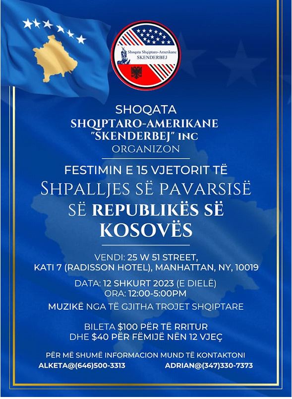 –Me rastin e 15-vjetorit të Shpalljes së pavaarësisë së Republikës së Kosovës Shoqata Shqiptaro-Amerikane –Skenderbej –Nju Jork, 12 Shkurt, 2023