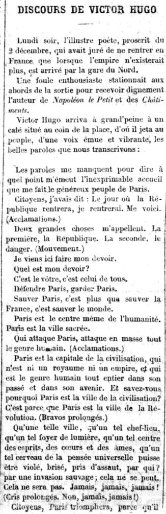 “Shpëtimi i Parisit është më shumë sesa shpëtimi i Francës, pra është shpëtimi i botës.” – Fjalimi i Victor Hugo përballë turmës entuziaste që po e priste në dalje të “Gare du Nord”, pas 19 viteve në ekzil (1870)