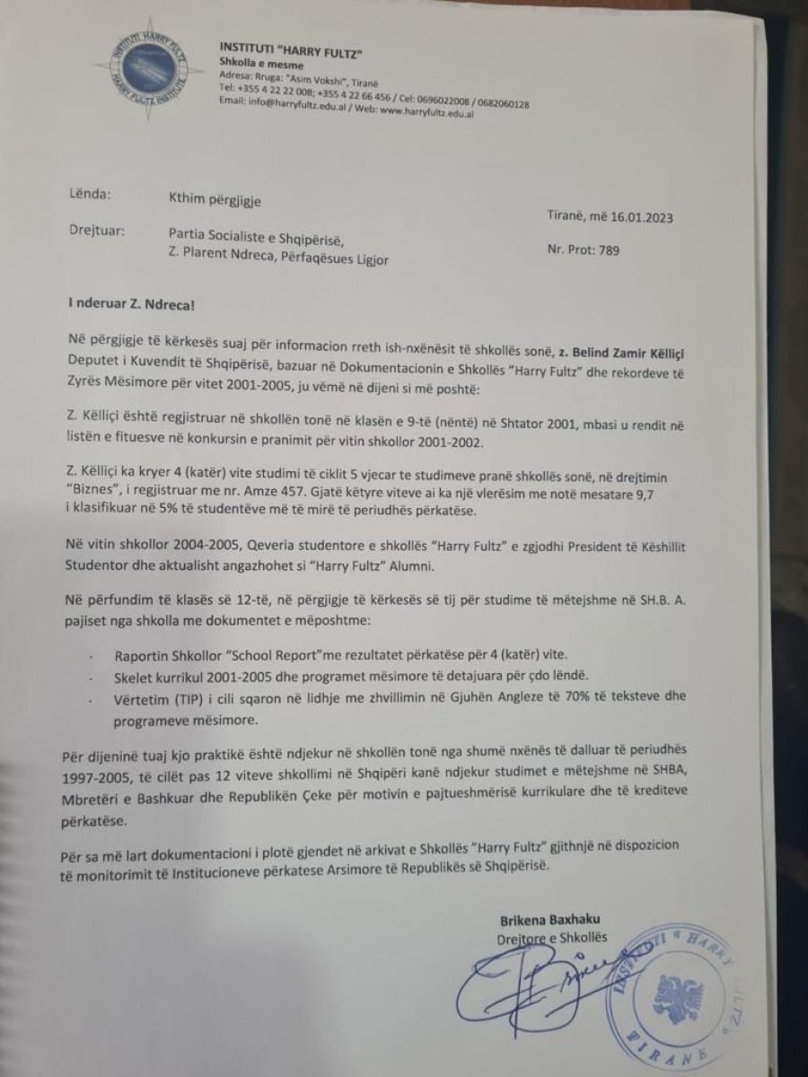 Shkresa e shkollës, tregon se si në shumë raste të tjera, si një praktikë që e kanë ndjekur shumë nxënës për të vijuar studimet në SHBA, në Britani, apo Çeki, edhe në rastin e Belind Kelliçit, kjo ka ndodhur pas 4 viteve.