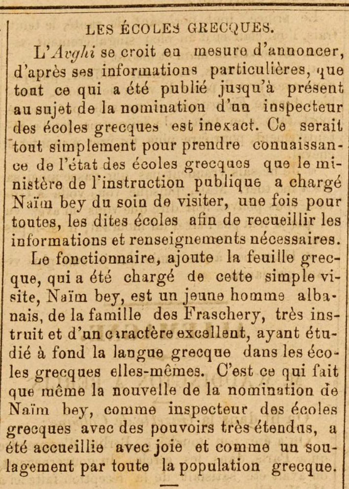 Stamboul (1883)- Si u prit emërimi i Naim Frashërit si inspektor i shkollave greke ?