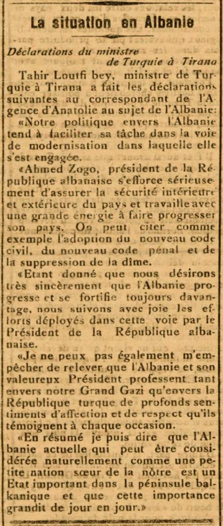 Stamboul (1928)- Elozhet e ambasadorit turk në Tiranë për Ahmet Zogun (Deklarata)