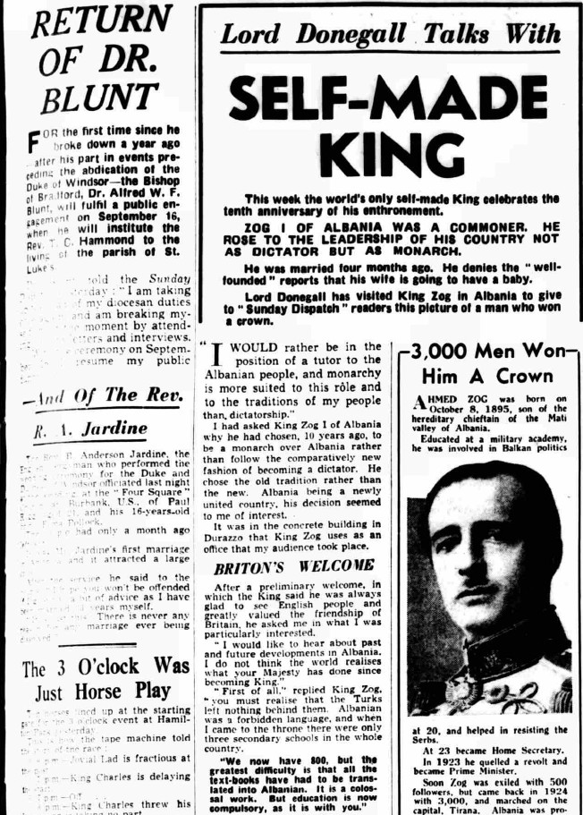 Lordi Donegall ka vizituar Mbretin Zog në Shqipëri për t’u dhënë lexuesve të “Sunday Dispatch” këtë pamje të një njeriu që fitoi një kurorë.