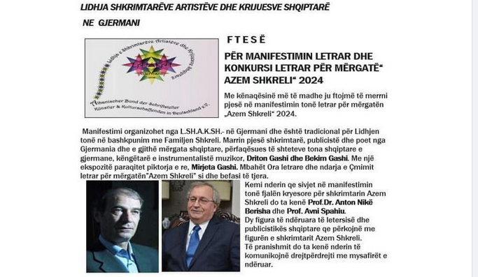 Manifestimi dhe Konkursi letrar Azem Shkreli po afrohet… May 15, 2024 Manifestimi dhe Konkursi letrar Azem Shkreli po afrohet… Të kalojmë disa çaste me mysafirët e … Read More twitterFollowfacebooklinkedin LEXO MË SHUMË