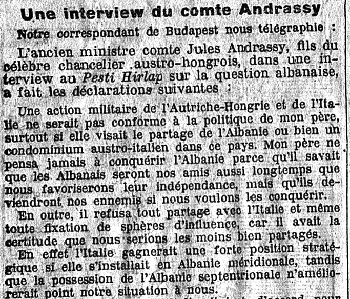 Gyula Andrássy, ish-ministër dhe kont austro-hungarez, për Pesti Hirlap (1913) : “Jam kundra ndarjes së Shqipërisë mes Austro–Hungarisë dhe Italisë.” November 25, 2018 Burimi : gallica.bnf.fr / Bibliothèque nationale de France Nga Aurenc Bebja*, Francë – 25 Nëntor 2018 … Read More twitterFollowfacebooklinkedin LEXO MË SHUMË
