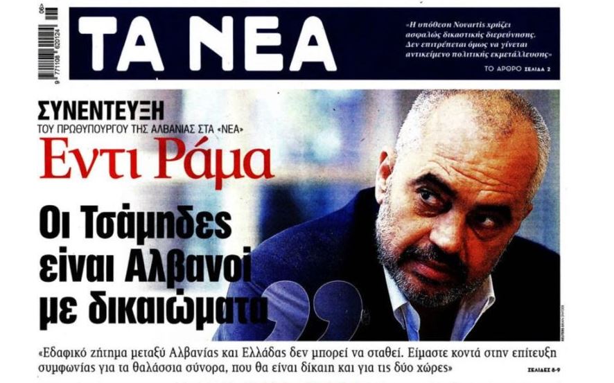 Kryeministri Edi Rama në kopertinën e gazetës greke: Çamët, shqiptarë me të drejta – Intervistë e Kryeministrit Edi Rama dhënë Gazetës greke Ta Nea … February 6, 2018 – Çamët janë Shqiptarë dhe gëzojnë të drejtat e plota Sot në faqen e parë të … Read More twitterFollowfacebooklinkedin LEXO MË SHUMË