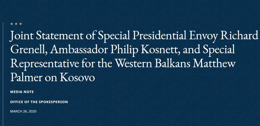 Joint Statement of Special Presidential Envoy Richard Grenell, Ambassador Philip Kosnett, and Special Representative for the Western Balkans Matthew Palmer on Kosovo – United States Department of State March 27, 2020 The United States stands with the people of Kosovo. We commend the continued efforts of … Read More twitterFollowfacebooklinkedin LEXO MË SHUMË