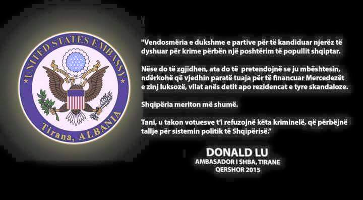 DONALD LU – JU TAKON JUVE TË REFUZONI KRIMINELËT QË TALLEN ME POLITIKËN June 20, 2015 VOAL – TIRANË- Ambasadori amerikan në Tiranë Donald Lu u ka dërguar të gjithë qytetarëve … Read More twitterFollowfacebooklinkedin LEXO MË SHUMË