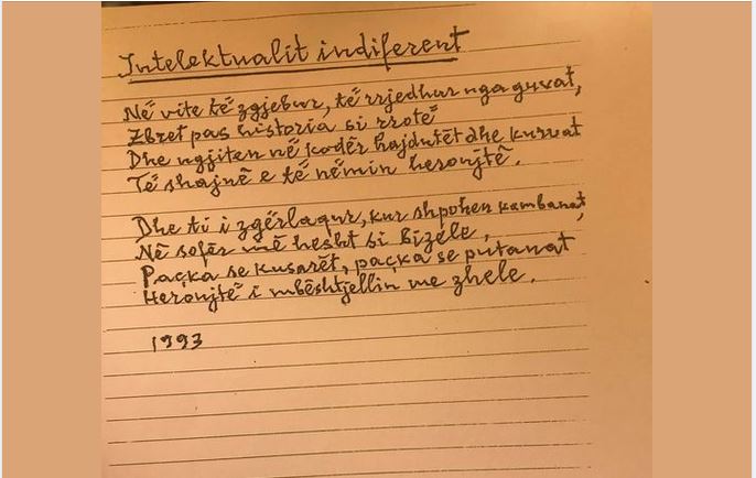 Intelektualit indiferent – Poezi nga DRITËRO AGOLLI (1931-2017) January 11, 2021 Në vite të zgjebur, të rrjedhur nga guvat, Zbret pas historia si rrotë Dhe ngjiten … Read More twitterFollowfacebooklinkedin LEXO MË SHUMË