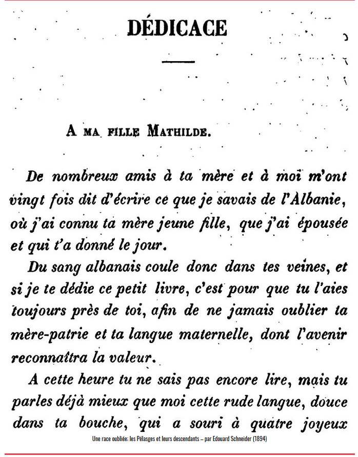 Kur Edouard Schneider i dedikonte vajzës së tij Mathilde librin për Pellazgët (1893): “Në damarët e tu rrjedh gjak shqiptar! Mos e harro kurrë mëmëdheun dhe gjuhën e nënës tënde!” January 14, 2018 Nga Aurenc Bebja*, Francë – 14 Janar 2018 Në fillim të veprës me titull “Une … Read More twitterFollowfacebooklinkedin LEXO MË SHUMË