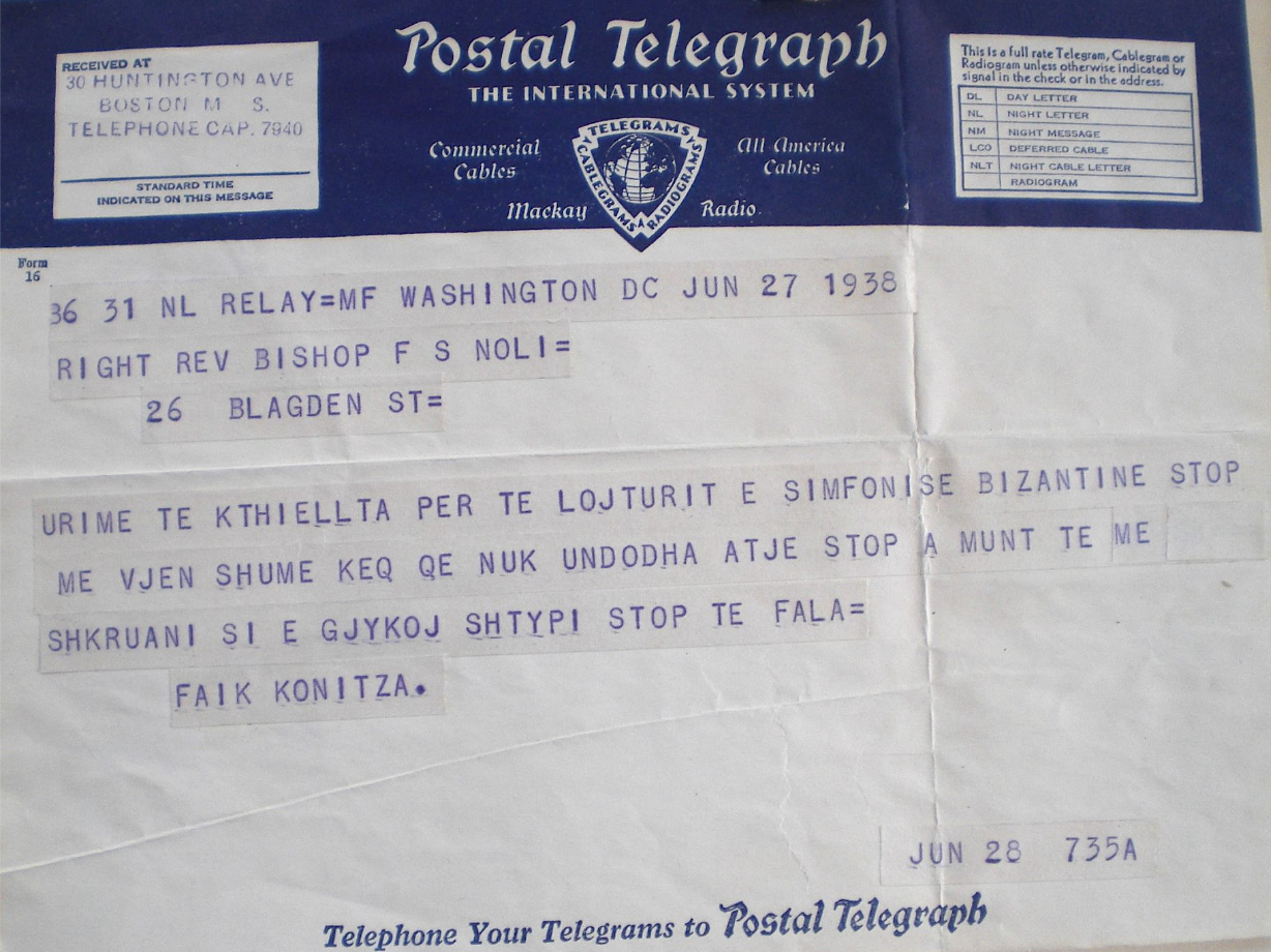 Foto e rrallë: Faik Konica telegram urimi Fan Nolit March 20, 2016 Voal – gazetari Ilir Ikonomi ka sjellë një telegram të vitit 1938 shkruar nga Ministri … Read More twitterFollowfacebooklinkedin LEXO MË SHUMË