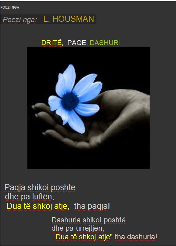 Dritë, Paqe dhe Dashuri – Poezi nga L. HOUSMAN (e ilustruar) – Përktheu e përgatiti FASLLI HALITI June 15, 2017 twitterFollowfacebooklinkedin twitterFollowfacebooklinkedin LEXO MË SHUMË