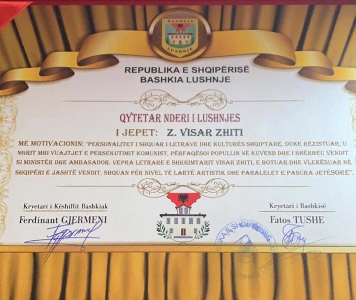 Lushnja e shpall “Qytetar Nderi” shkrimtarin e shquar Visar Zhiti January 22, 2021 VOAL – Shkrimtari i shquar Visar Zhiti shpallet “Qytetar Nderi” në Lushnjë. Me këtë rast … Read More twitterFollowfacebooklinkedin LEXO MË SHUMË