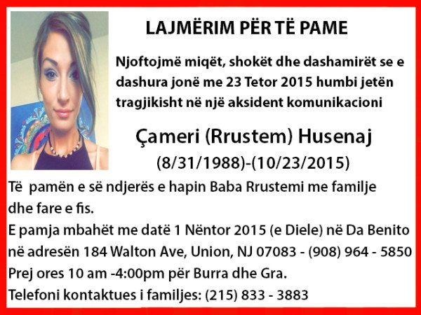 27 vjeçarja Çamëri Rrustem Husenaj humb jetën në aksident – familja hap të pame October 31, 2015 Familja Husenaj njofton Komunitetin, miqtë, shokët dhe dashamirët se e dashura e tyre Çamëri Rrustem … Read More twitterFollowfacebooklinkedin LEXO MË SHUMË