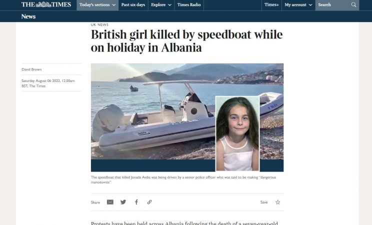 Mediat britanike shkrim për vrasjen e Jonada Avdisë në Himarë: U godit nga skafi i komisarit Arjan Tase