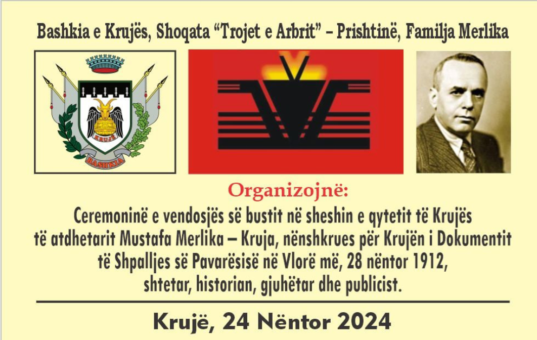Më 24 nëntor përurimi i bustit të Mustafa Merlika – Kruja në sheshin e qytetit të Krujës November 14, 2024 Bashkia e Krujës, Shoqata “Trojet e Arbrit” – Prishtinë, Familja Merlika Ftesë Ftoheni të merrni … Read More twitterFollowfacebooklinkedin LEXO MË SHUMË
