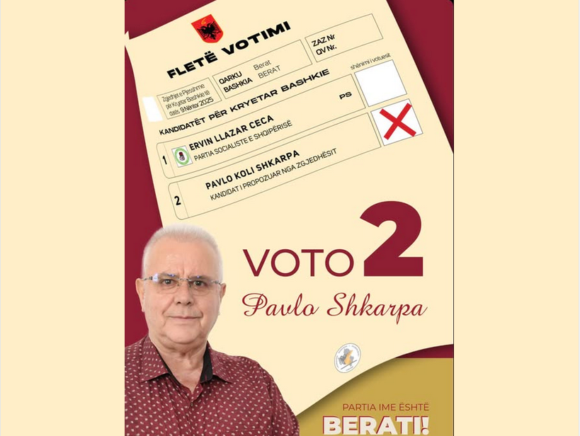 Berat- Kandidati i pavarur Pavlo Shkarpa: Votoni për ndryshimin, për ndershmërinë dhe për një Bashki që i shërben qytetarëve, jo pushtetit November 9, 2025 VOAL- “Votoni për ndryshimin, për ndershmërinë dhe për një Bashki që i shërben qytetarëve, jo … Read More twitterFollowfacebooklinkedin LEXO MË SHUMË